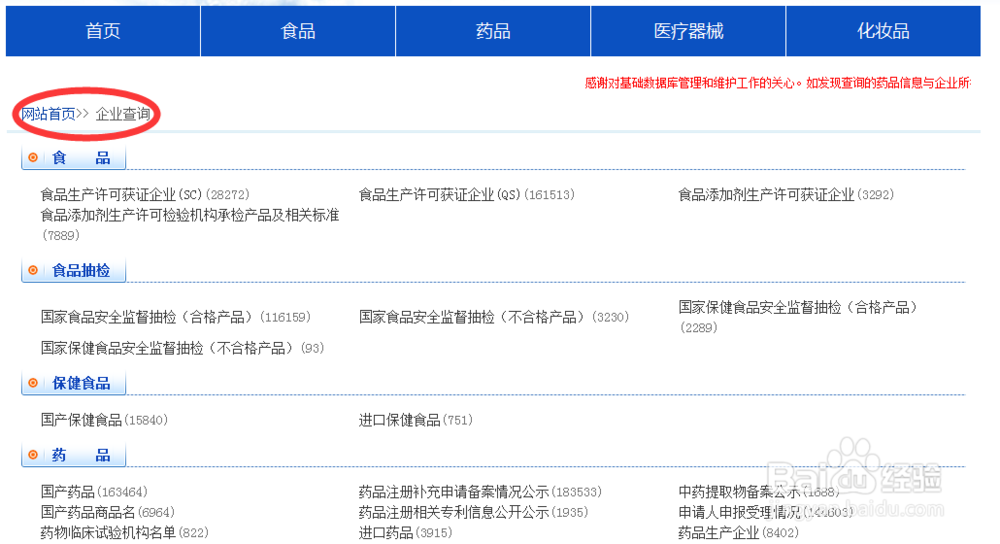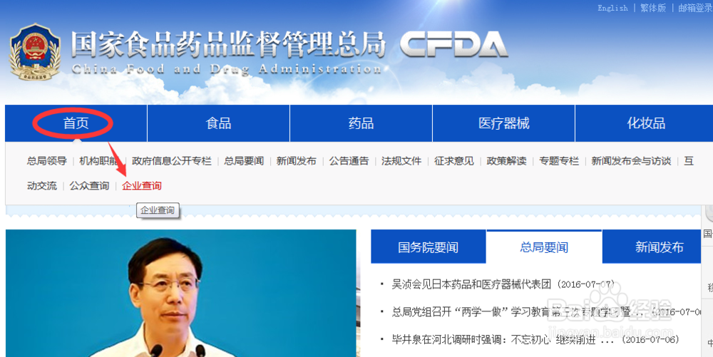 查询最好去官方途径,首先进入国家食品药品监督管理局官网,然后点“首页”下拉菜单的“企业查询”。