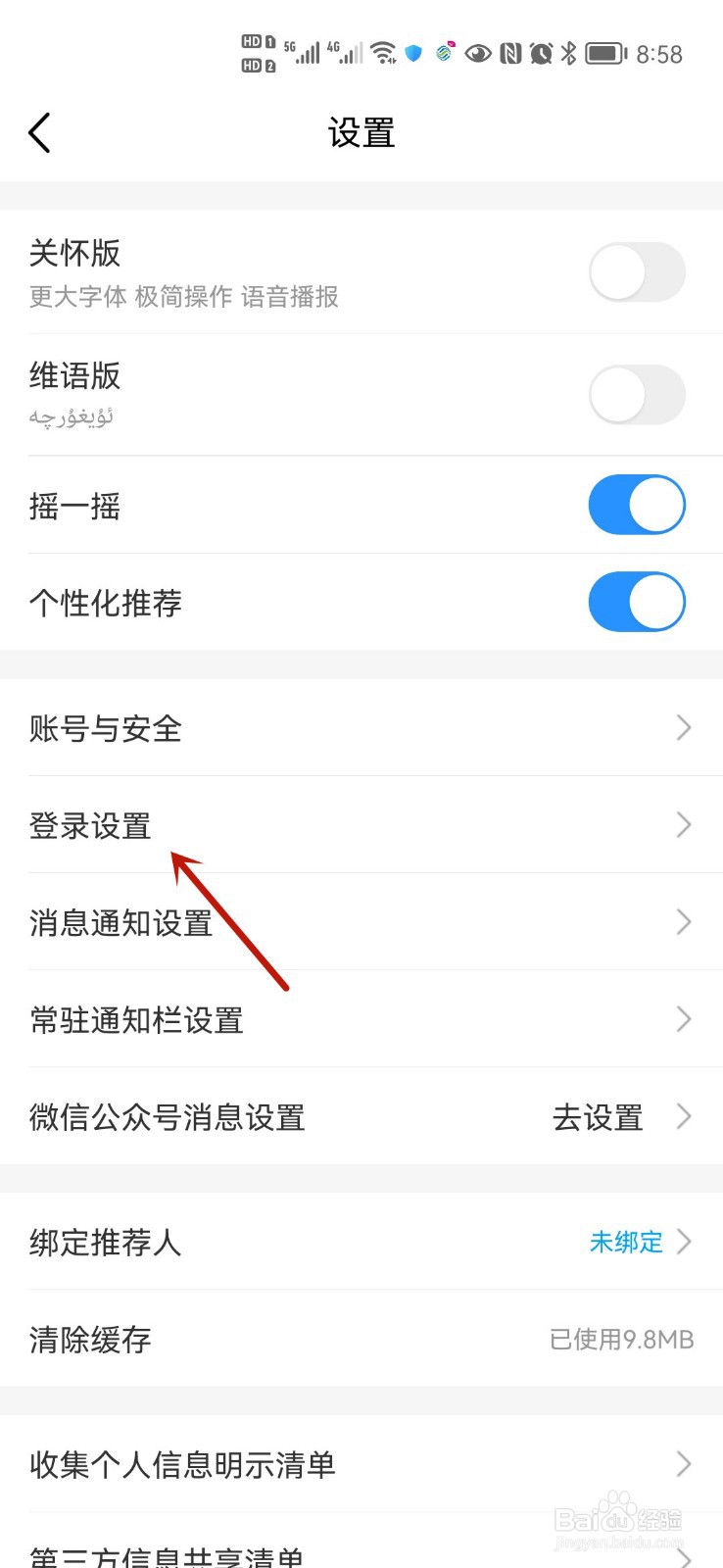3/4在设置页面,打开登录设置页面。