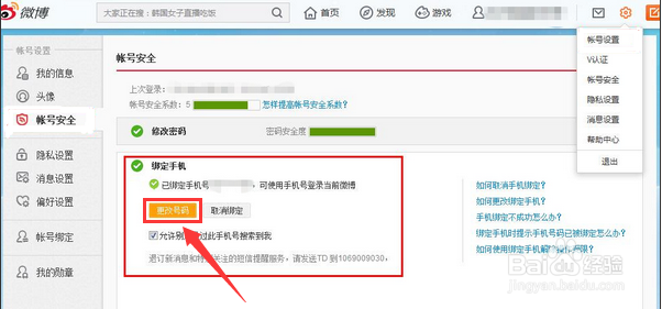 4/8点击之后,我们就能看见相关的“更换号码”等按钮,如果我们更换了手机号码,想要现在使用的手机号码作为登陆名,就点击更换号码按照步骤操作即可。
