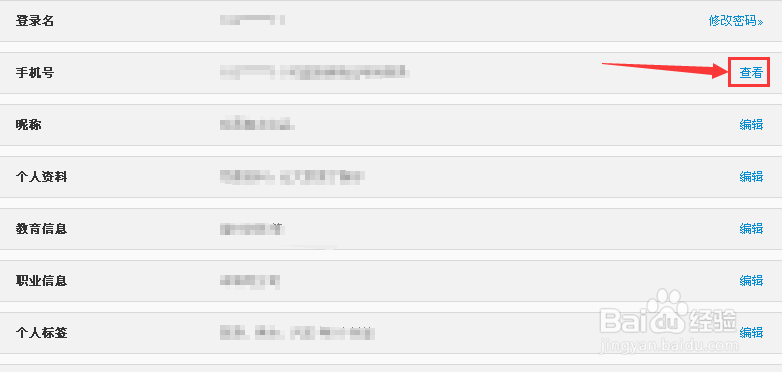 3/8进入账号设置界面后,我们就能看到手机号那一栏的信息,如果我们先前用的是手机号码为登陆名,但是这个手机号码不使用了,我们要点击后方的“查看”一栏。