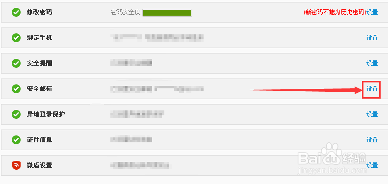 7/8进入账号与安全界面中,我们找到安全邮箱那一栏,再点击后方的“设置”按钮。