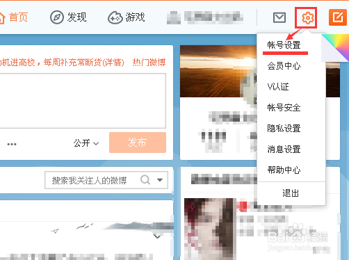 2/8登陆成功后,进入微博界面,我们再点击右上方的齿轮按钮,点击后在弹出的页面中选择“账号设置”。