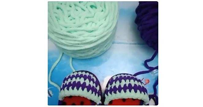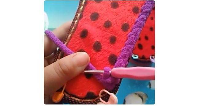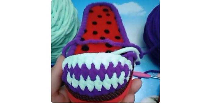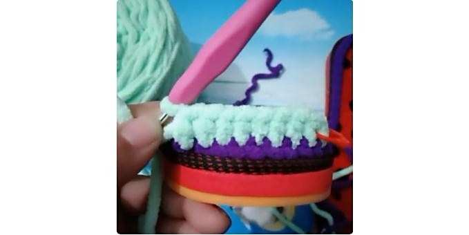 7、然后,再换线(紫色),钩织鞋头的第3行,要从隔一针的地方开始钩织第四行。