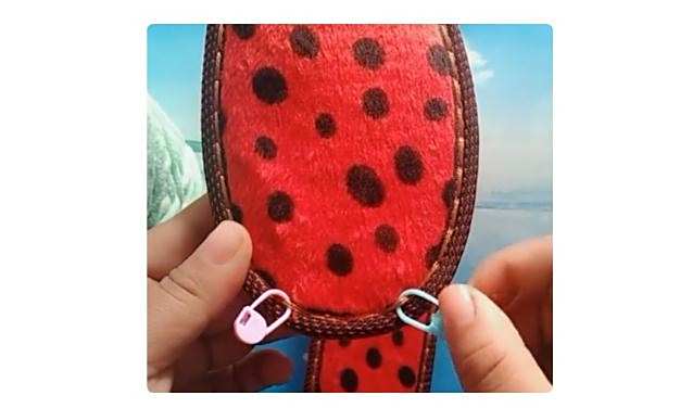 1、先将买到的拖鞋底,用彩色别针分别在两只鞋的前后,做上鞋头、鞋尾的记号,避免钩织时不对称。