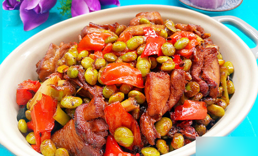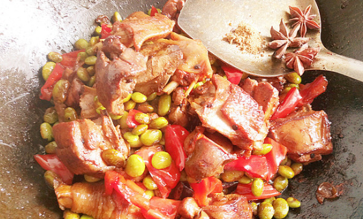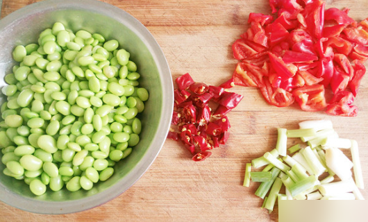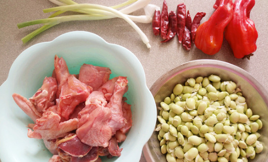 准备材料:鸡肉、嫩黄豆、辣椒、葱