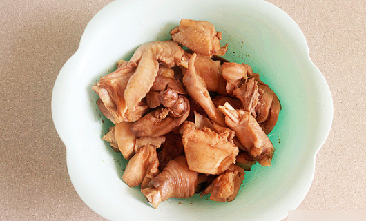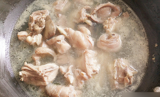 2、鸡肉多浸泡多换水几次洗净血水,鸡肉冷水下锅后烧开,再煮30分钟。