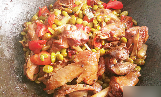 8、加入适量水,烧至水干,鸡肉和豆子都熟了关火,可用筷子戳一下鸡肉,能戳烂即可。