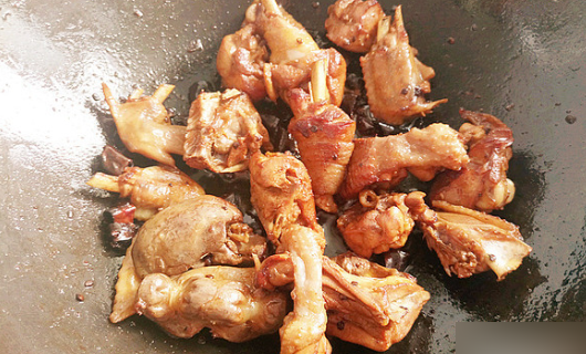 6、锅中倒油烧热,加入朝天椒炒出辣味,加入鸡块翻炒。
