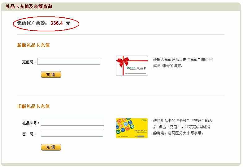 2. 进入“我的礼品卡”页面后,输入新版礼品卡的充值码或旧版礼品卡的卡号和密码,点击“充值”。同时可查询礼品卡的余额。