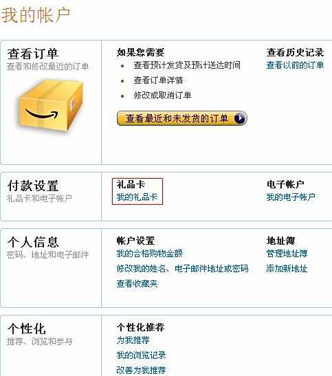 首先登陆您的亚马逊账户,如没有账户可先注册一个。 登录“我的帐户”后点击“我的礼品卡”。