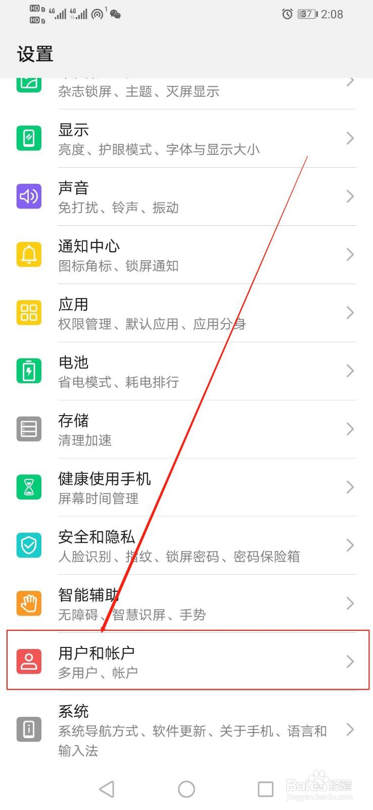 3/7点开“设置”之后,向上滑手机,找到“用户和账户”,如图