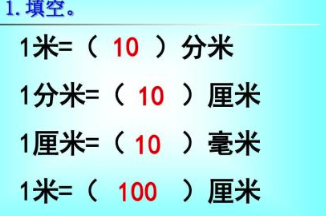 一米等于十分米,一分米等于十厘米,一厘米等于十毫米。