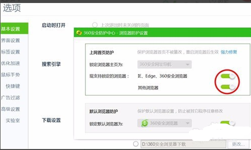 3.然后在搜索引擎中找到现支持锁定的浏览器,将后面的两个关闭,如下图。