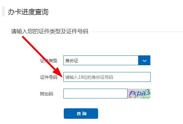 4、进入办卡进度查询后,输入证件号码,一般为身份证号和附加码。