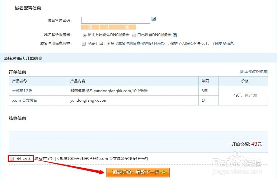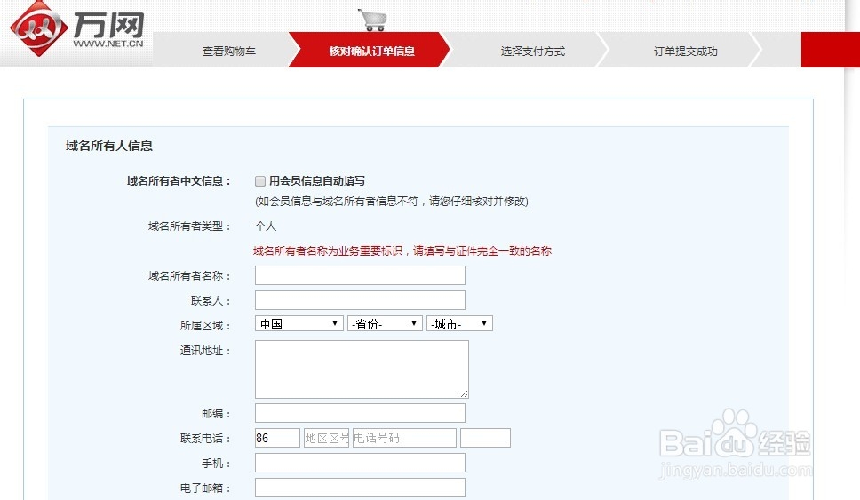 4/7买域名和实物不同的是,实物看中一个东西支付就可以了。域名还需要填写域名所有者的一些中英文资料。填写好以后,点击【确认订单,继续下一步】