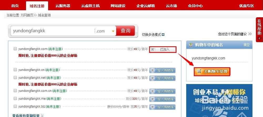 2/7查询到你想的域名没有人注册,你就可加入到购物车里去,再去购物车结算。