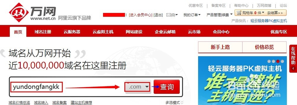先在万网注册一个账号,登陆进去,再查找你一想要的域名。我以注册.COM的域为例做演示。