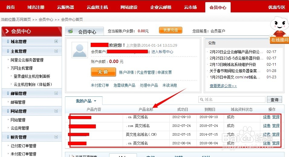 7/7购买成功以后,在万网中的【会员中心】----【我的产品】中看到已购买到的域名。但是不如下所示那样那么多个域名。买一个只会显示一下个的。