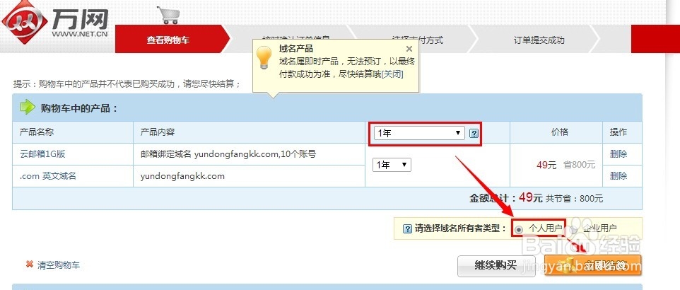 3/7选择你购买的时间,选择域名所有者类型,最后点击【立即结算】