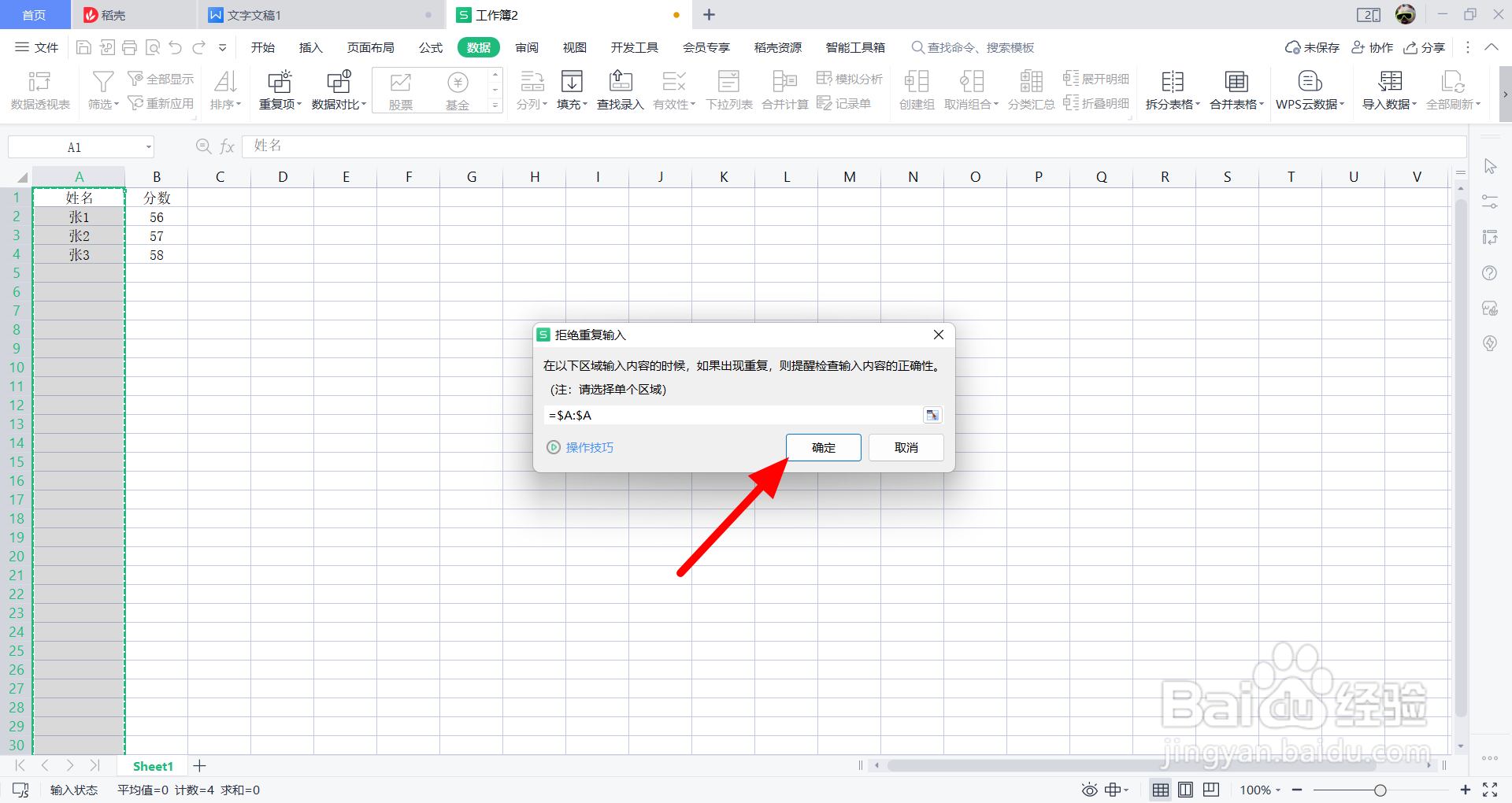 excel设置不允许输入重复项