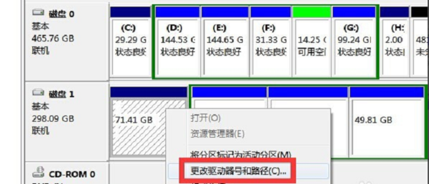 2.其次右键点击无法正常显示盘符的分区,从弹出的菜单中左键点击“更改驱动器号和路径”。