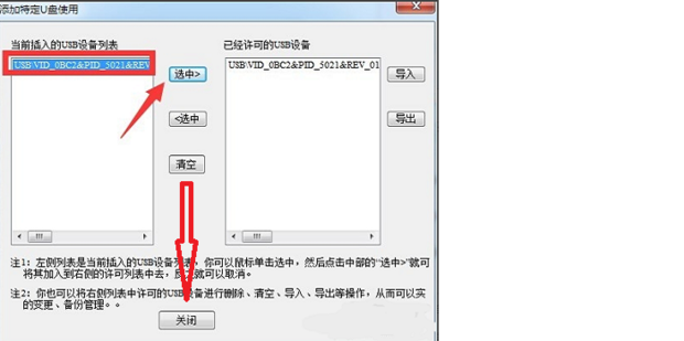 4.然后在新打开的界面中,点击已插入电脑的移动硬盘,再点击”选中“按钮,将其添加到”允许列表“中,最后点击‘关闭”即可。