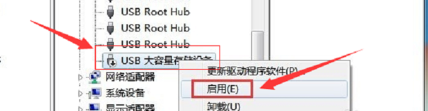 3.然后在下拉菜单右键点击“大容量存储设置”,再左键点击“启用”即可。
