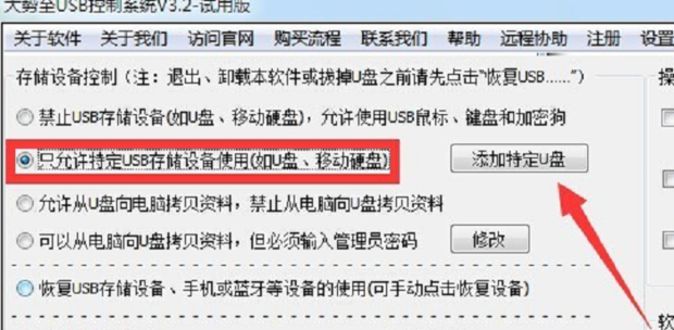 3.也可以设置特定移动硬盘的使用,只需要勾选“只允许特定USB存储设备(如U盘,移动硬盘)”项,点击’添加特定U盘“。
