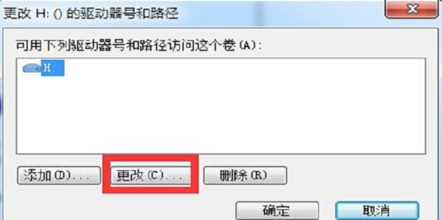 3.从“更改驱动器号和路径”窗口中,选中无法显示的盘符,然后左键点击“更改”按钮。