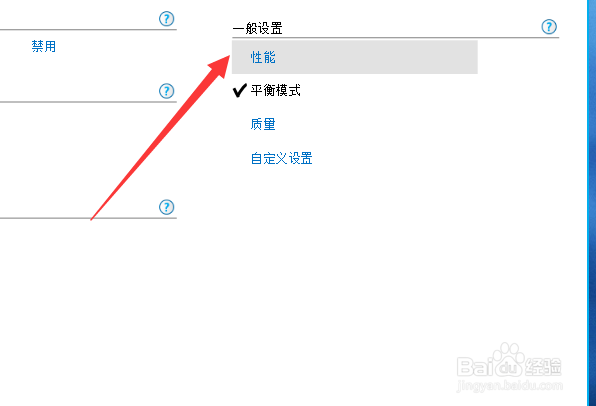 5/6如果我们还不行,我们再次返回到显卡控制面板的3D界面,在最右边,在一般设置界面里,我们是平衡模式还是性能模式。我们设置成性能模式尝试一下。