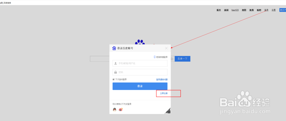 我们首先打开百度,点击左上角的登录,弹出窗口会有注册的按钮。