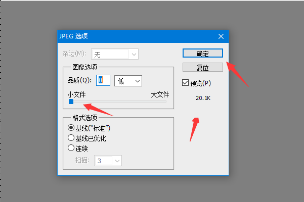 10、在出现的JPG选项中拉动大小文件中间的按钮,可以看到预览的大小当前为20K,点击确定按钮。