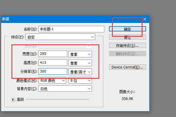 3、在出现的新建画布界面中输入宽度为295、高度为413像素,分辨率设置为300以后点击确定按钮。