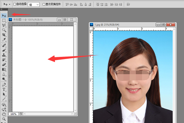 6、点击工具栏的鼠标箭头,按住该图片不放将其拖移到新建的画布上。