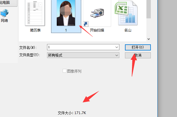 5、在出现的打开对话框中选中需要的图片,可以看到当前图片大小为171K。