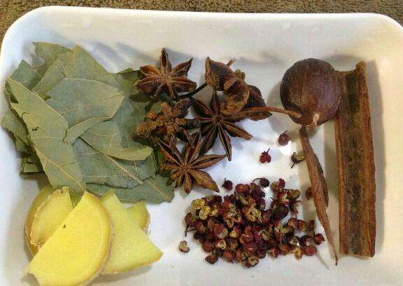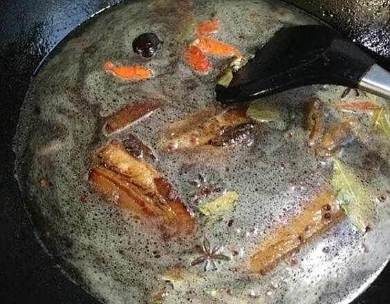 3、将准备好的香料加入锅中一起炒制。