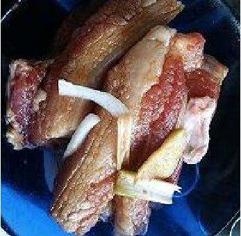 1、五花肉洗干净控干水分,放入无油煎锅,将肉皮烙至紧实,盛出放入碗中。这样做的目的是煮出来的肉有嚼劲,口感非常棒。加入生抽、大葱、生姜、白酒搅拌均匀,腌制两个小时。