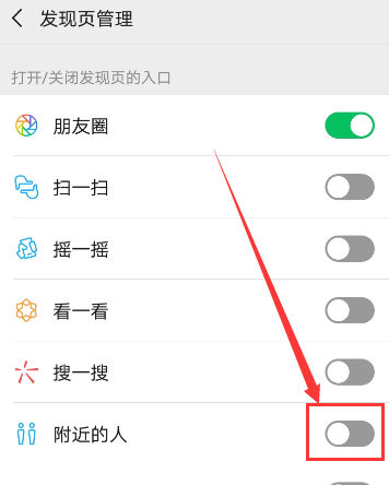 四、打开发现页管理列表后,点击开启“附近的人”右边开关。