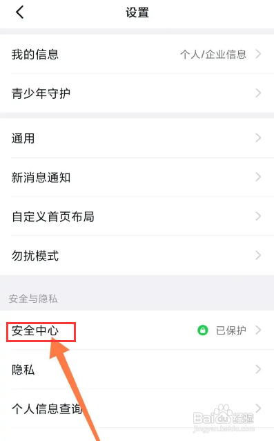 首先打开钉钉设置页面,点击“安全中心”进入,如图。