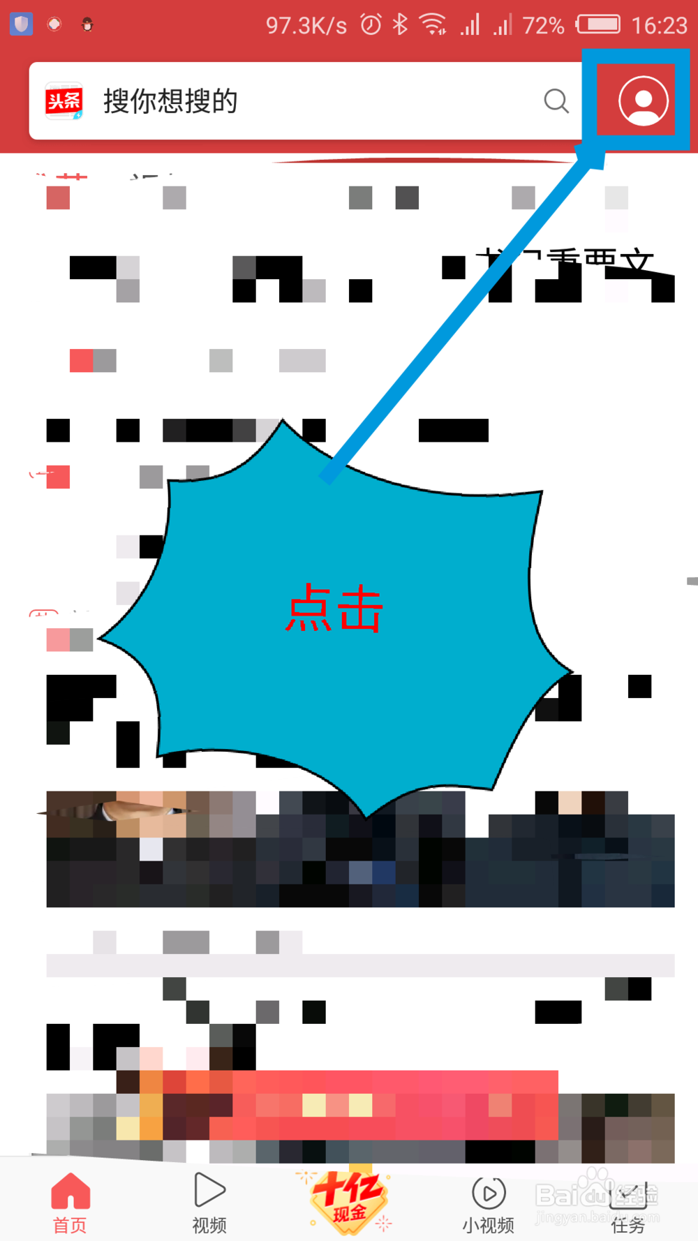 2/5打开极速版后,在打开的首页界面,点击右上角的头像图标。如图所示