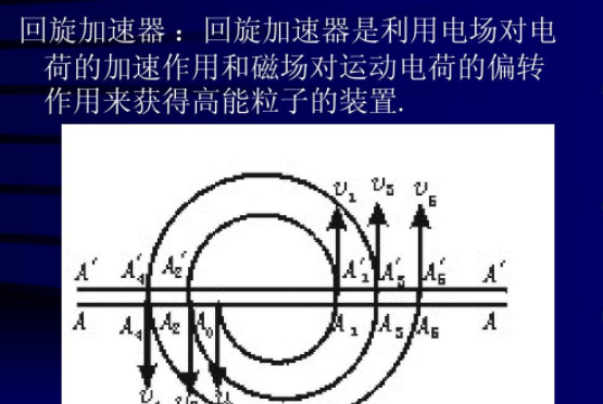 (1)磁场的作用:带电粒子以某一速度垂直进入匀强磁场时,只在洛伦兹力作用下做匀速圆周运动,其中周期与速率和半径无关,使带电粒子每次进入D形盒中都能运动相等时间(半个周期)后,平行于电场方向进入电场中加速。