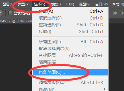 2、然后在ps上方的工具栏中单击选择,然后单击色彩范围,如图所示。
