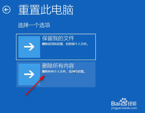 4/4之后选择“仅限删除我的文件”,等到重置完毕,电脑可以正常使用啦~