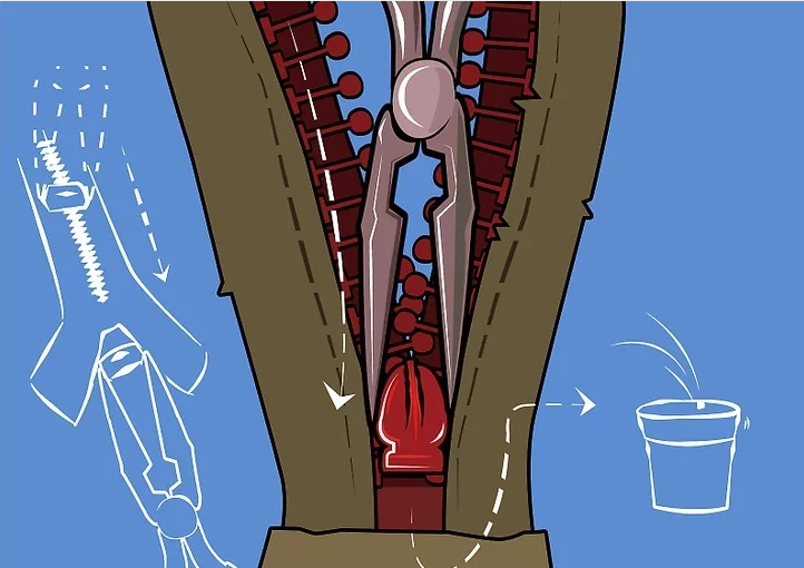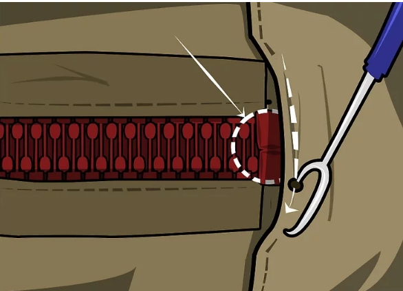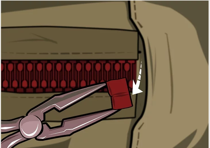 1、使用拆线器拆掉拉链末端的缝合线,两边的都要拆。不需要拆太多。拆线的目的是使拉链末端的金属合片以及末端的结构露出来。不要想着把整个拉链都拿掉。拿掉金属合片。可以使用尖嘴钳将金属合片打开取下。小心点儿,以防拆掉过多的线,或者不小心把拉链搞坏。