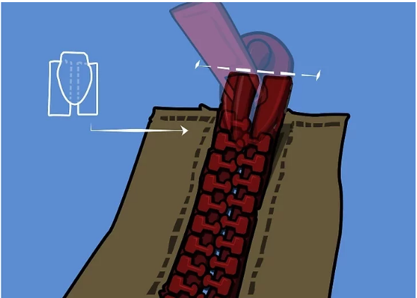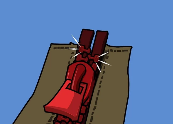 3、小心地把新滑块安上。在把滑块拉上去之前,先要使拉链进入滑块的上方开口,然后再让它通过滑块下方。