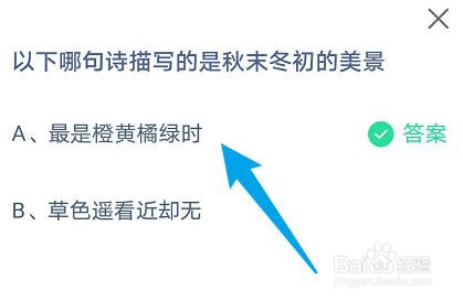 2/210月27日题目是:以下哪句诗描写的是秋末冬初的美景? A、最是橙黄橘绿时 B、草色遥看近却无正确答案是:最是橙黄橘绿时 。(描写秋末冬初的美景的诗句是最是橙黄橘绿时)