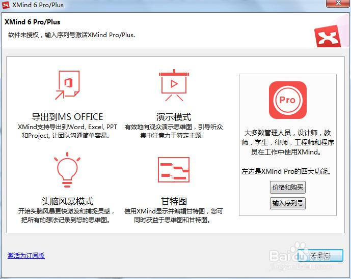 购买:单击XMind 6 Pro/Plus对话框中的“价格和购买”进入XMind中文官方网站进行购买。