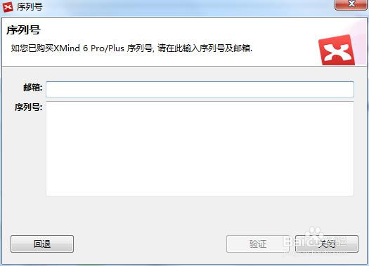 购买正版成功后将会有序列号/授权码/激活码发送至您填写的邮箱中;点击XMind 6 Pro/Plus对话框中的“输入序列号”按钮会弹出如下序列号对话框,将邮箱中的一连串数字字母样式的序列号填写至序列号窗口,单击验证即可。