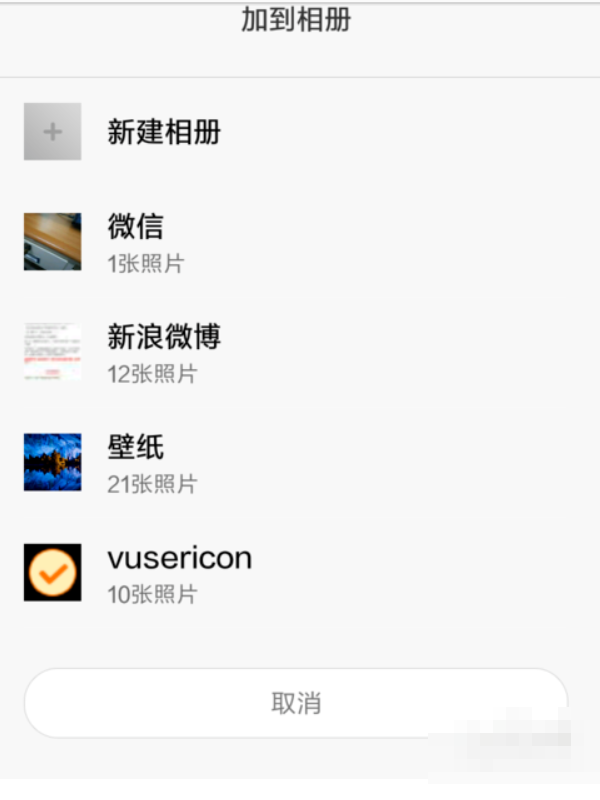 5、接下来,点击选择既有的相册或者是新建一个手机相册,然后就可以收到系统消息提示了,相册已经成功的存储了该图片。