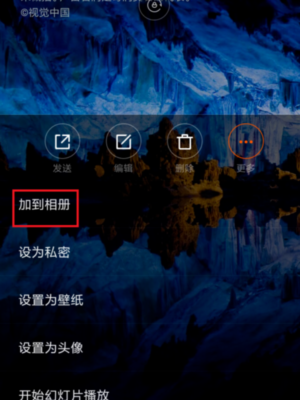 4、在接下来弹出的菜单选项中,可以看到一个“加入相册”的选项,点击之后即可将要保存的壁纸图片加到手机的相册中。
